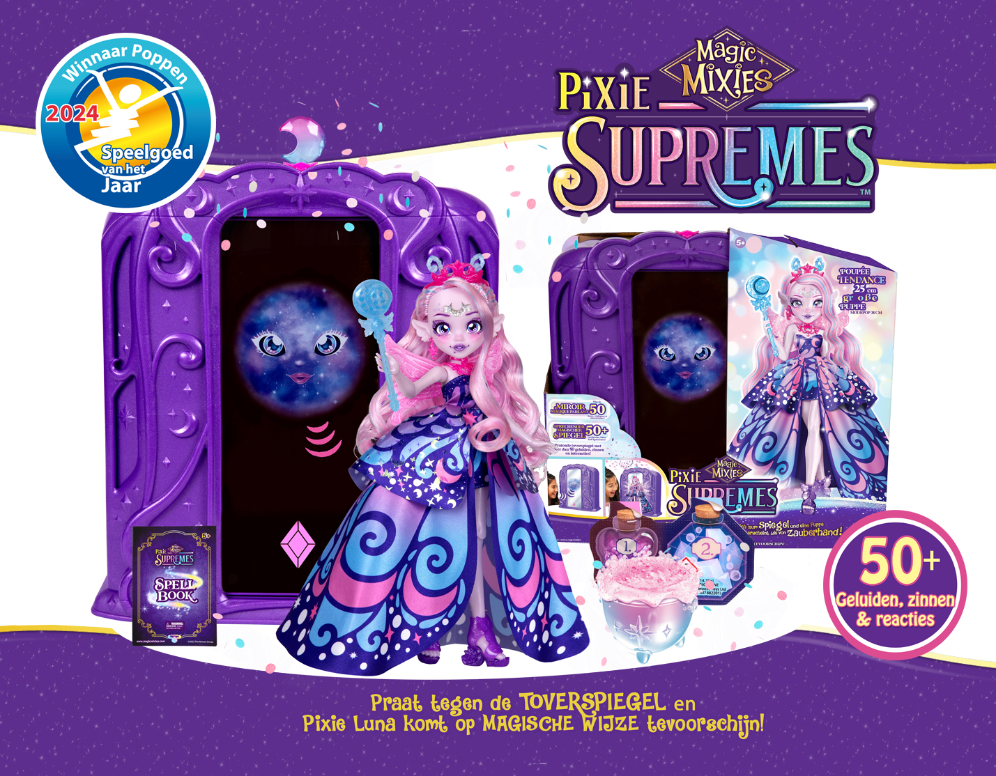 Vandaag zijn de winnaars weer bekendgemaakt! In de categorie Poppen heeft de vakjury Pixie Supremes Magische Toverspiegel verkozen tot winnaar Speelgoed van het Jaar 2024! De Magische Toverspiegel uit de Magic Mixies serie, zal tegen je praten en je instructies geven om een toverdrankje te maken van de meegeleverde ingrediënten. Uit de toverdrank zal de prachtige Maankristal ontstaan waarmee je de betovering van de spiegel kunt verbreken. Terwijl gekleurde confetti uit de spiegel omhoog schiet, verschijnt Pixie Supreme Luna uit de Toverspiegel met 5 glimmende accessoires. Luna is de vlinder Pixie, ze is 30 cm groot, volledig beweegbaar met 9 beweegpunten en draagt een prachtige jurk en schoenen. Luna heeft lang, golvend, borstelbaar haar en wordt geleverd met een speciale poppenstandaard, waardoor ze erg leuk is om te stylen en neer te zetten. De vakjury oordeelde dat deze pratende Magische Toverspiegel fantasierijk spelen stimuleert. Het feit dat de magische onthulling van de pop opnieuw beleefd kan worden, maakt het leuk om samen met anderen met dit speelgoed te spelen en de magie te beleven.