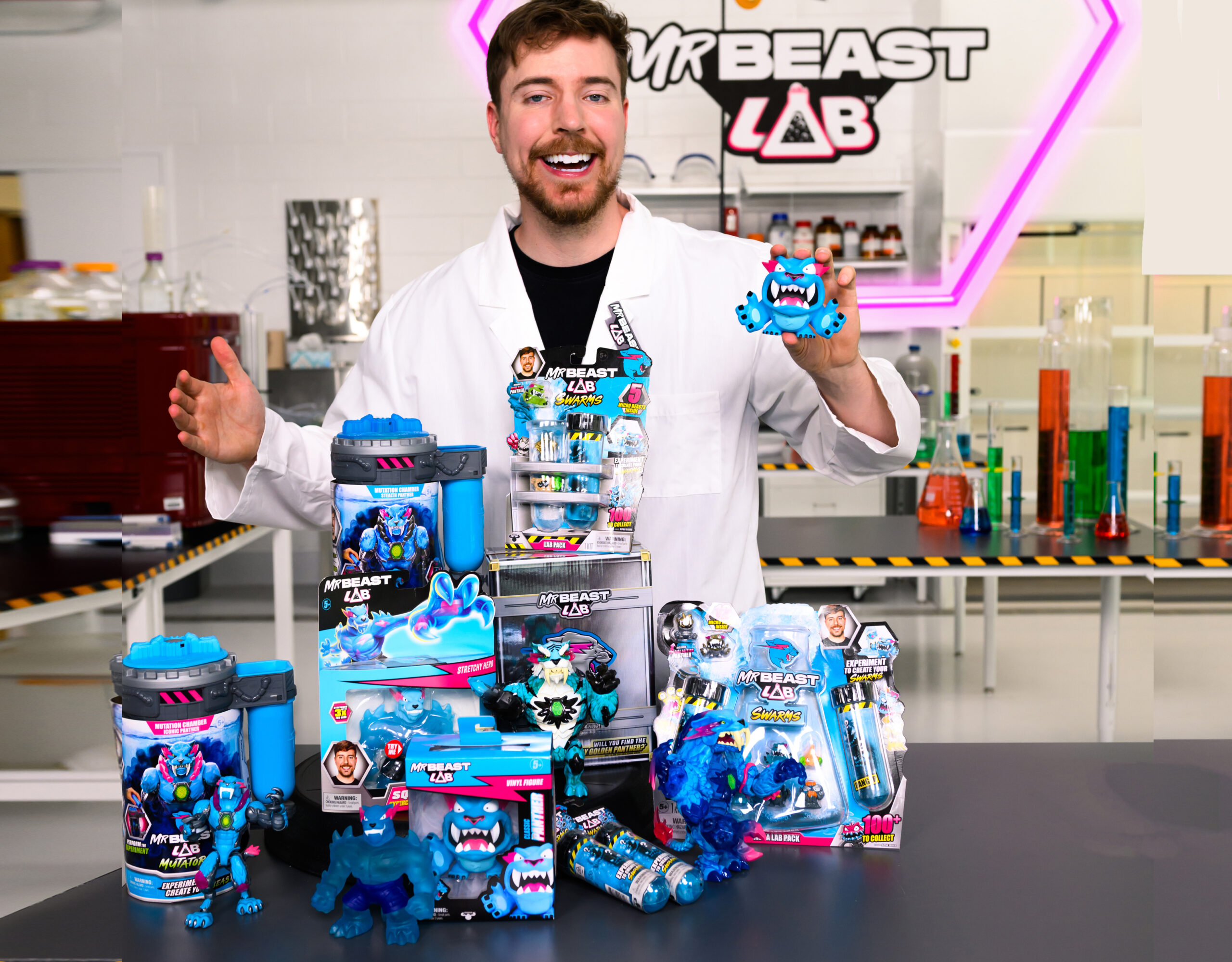 Een van de series is MrBeast Lab Swarms, een serie van meer dan 100 microbeesten om te verzamelen. Voeg water toe aan de reageerbuis, schud deze krachtig en zie hoe de Swarms-microbeesten uit een mengsel van bruis tevoorschijn komen. De Swarms figuren variëren van gewone tot zeldzame, speciale edities en 1.000 gelimiteerde Hyperchrome Panthers.